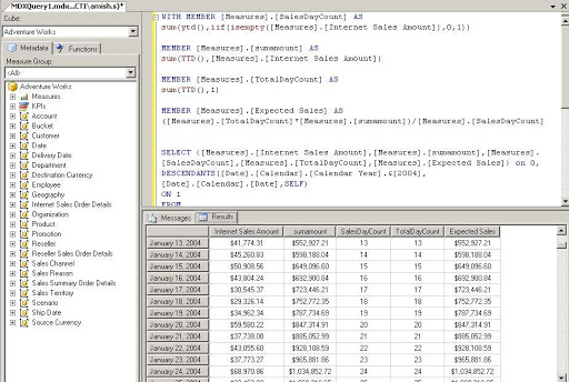 SELECT {[Measures].[Internet Sales Amount],[Measures].[sumamount],[Measures].[SalesDayCount],[Measures].[TotalDayCount],[Measures].[Expected Sales]} on 0,